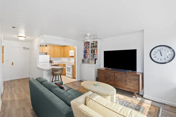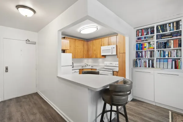Perched on the second floor, this studio has a great layout. The living area has a custom Murphy Bed with built-ins which allows for different furniture placement. The cook's kitchen has an open and large breakfast bar, attractive wood cabinets, white contemporary appliances along with an 18" dishwasher. There's beautiful vinyl plank flooring throughout. The bathroom has a newer vanity and a large walk-in shower. Great closet space with a large walk-in closet and coat closet. There's nothing to do but move in. 3550 North Lake Shore Drive is a high-end, full-service building with 24-hour door staff, roof top decks, party room, fitness room, commissary, 2 laundry rooms, secure receiving room, on-site management office, and maintenance staff. Monthly valet parking is available for 160...no wait. Public transportation at your front door. Walk to the Lake, Wrigley Field, and all of East Lakeview. Assessments include heat, water, and Xfinity expanded cable. Owner pays electricity and internet. No dog and non-smoking building. No in unit washer/dryer allowed. Owners must own for 18 months before renting, but there is no "Rental Cap". Reserves are approximately 9M | No specials planned or pending. NOTE: 3550 has first right of refusal, therefore, FHA financing is not allowed.