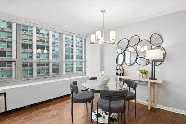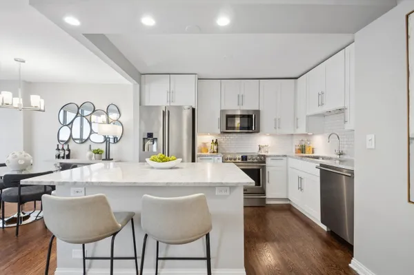 Just move in! Beautifully and fully renovated one-bedroom home in 3550 N. Lake Shore Drive: a well managed and full service lakefront high-rise, offering views of both the lake and Wrigley Field. The unit features a thoughtful layout, perfect for living, working and entertaining. Special features include: an open living, dining, and kitchen spaces, with the living room offering a custom built-in entertainment center. The kitchen was fully renovated with white shaker cabinetry, soft close drawers, marble countertops, subway tile backsplash, a large island with room for seating, stainless steel appliances including a five-burner range, and under-cabinet lighting. The bedroom accommodates full-size furniture and includes an oversized walk-in closet with professional organization. The updated bathroom features a large walk-in shower with rain and handheld fixtures, marble tile flooring, and a modern vanity with storage. This well designed home also offers ample storage throughout, including a separate linen closet plus generous foyer coat closet. Along with large windows to lake and city views, additional features include a converted multi-purpose space (oversized pantry or office), beautiful, solid oak hardwood flooring throughout, a defined foyer and updated lighting with dimmers and custom window treatments. Well-managed building with approximately $9M in reserves and recent capital improvements. Amenities include 24-hour door staff, on-site management and engineer, rooftop deck with lake and skyline views, fitness center, party room, bike storage, convenience store, package room, and library. Valet parking available for $160/month. Assessments include heat, water, and Comcast cable. Welcome home!